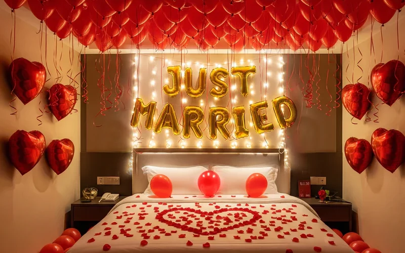 You focus on creating an emotional and visually appealing experience. Every decoration element—rose petals, candles, fairy lights, fragrances, and themed décor—is thoughtfully arranged to bring comfort, intimacy, and romance into the space. The result is a setting that enhances the moment and makes your first night feel truly magical.